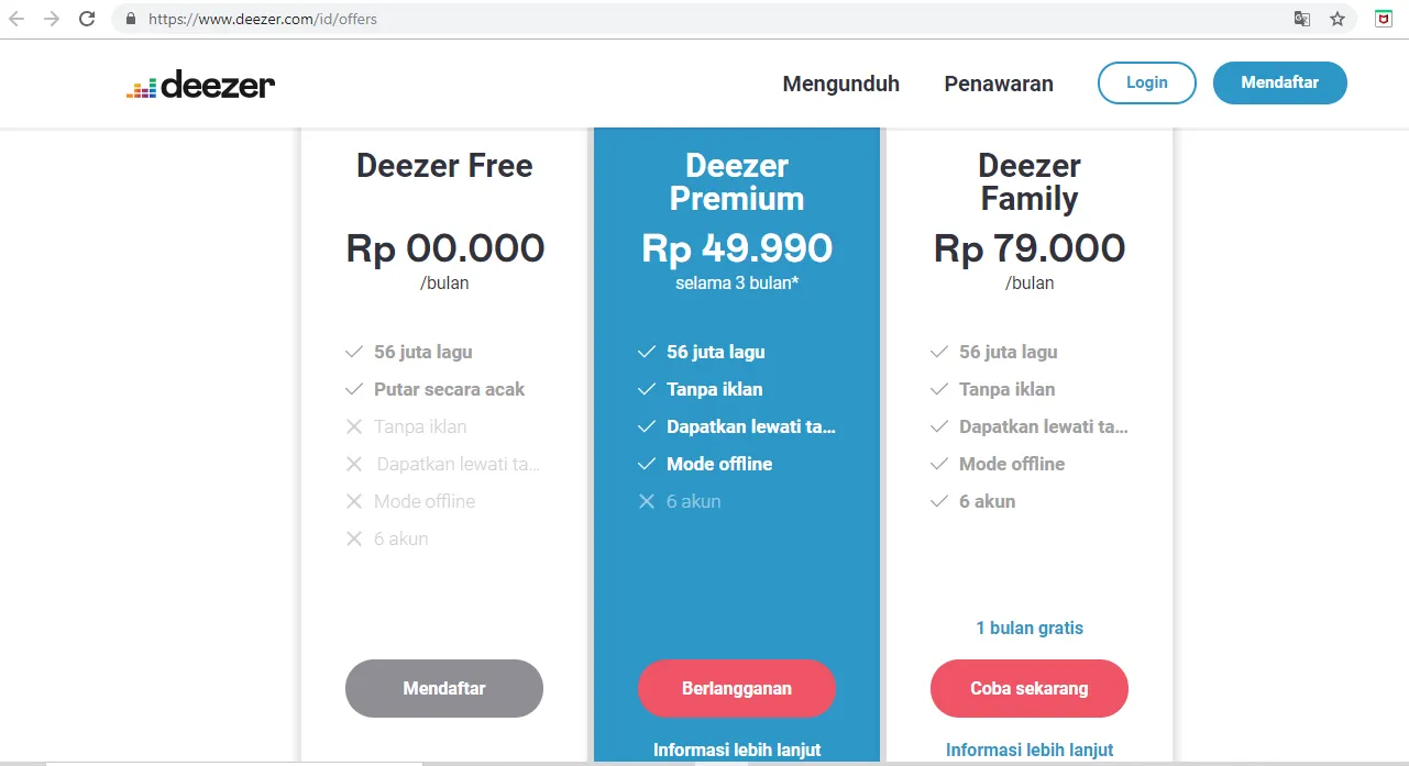 Perpustakaan musik Deezer juga terkenal lengkap, ada lebih 30 juta lagu bersarang di dalamnya. Untuk menikmati fasilitas langganan Deezer, kalian akan dikenakan biaya sebesar Rp 49.990/3 bulan untuk premium dan Rp 79.000/bulan untuk paket family.