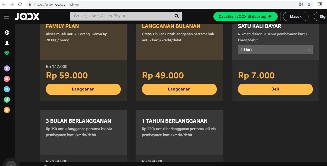 Ada Family Plan untuk 3 orang dengan harga Rp 147.000 dan diskon menjadi Rp 59.000. Langganan bulanan dengan harga Rp 49.000. Kalian juga bisa menikmati musik per harinya dengan biaya Rp 7.000. Selain itu, JOOX juga menawarkan biaya berlangganan untuk 3 bulan seharga Rp 139.000 diskon menjadi Rp 119.000 dan 1 tahun berlangganan dengan biaya Rp 509.000 dan diskon menjadi Rp 229.000