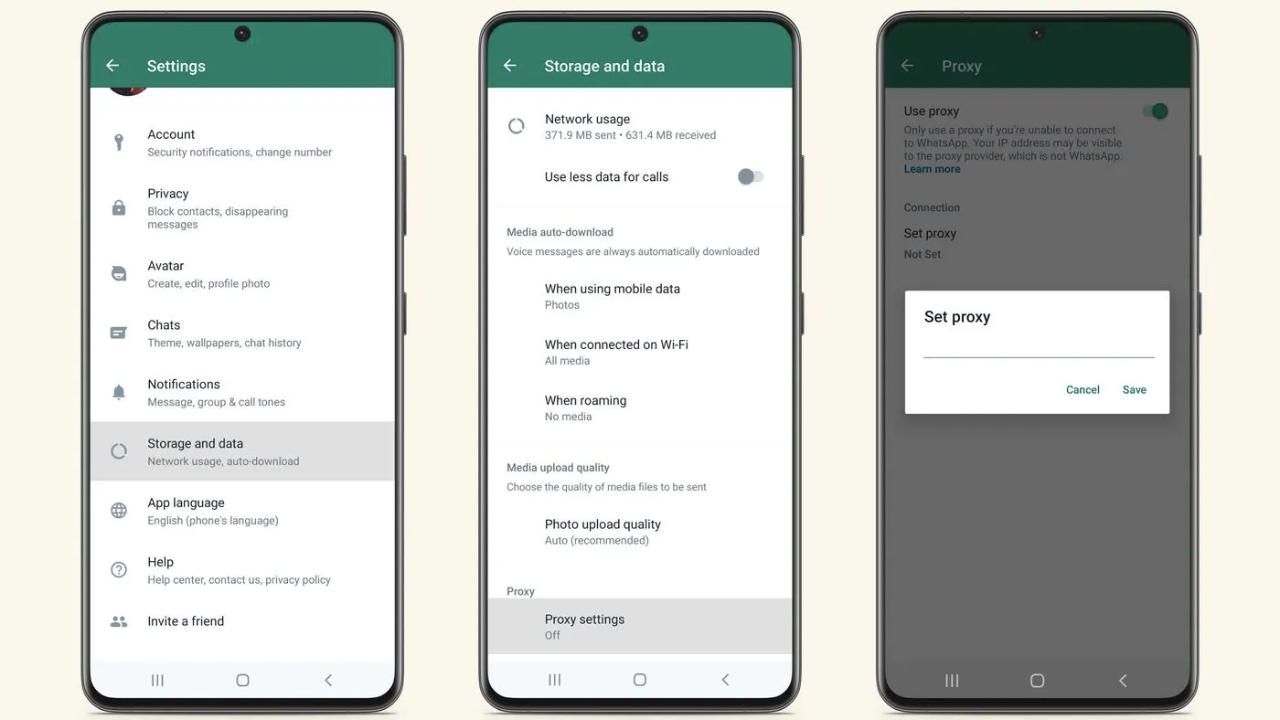 WhatsApp telah menambahkan fitur server proxy yang telah tersedia di versi terbaru WhatsApp. Dengan memilih proksi, pengguna dapat terhubung ke WhatsApp melalui server yang disiapkan oleh relawan dan organisasi di seluruh dunia yang berdedikasi untuk membantu orang-orang berkomunikasi dengan bebas. Menurut WhatsApp, kamu juga dapat mempelajari cara untuk menyiapkan proxy, jika ingin membantu orang lain terhubung ke aplikasi tersebut.