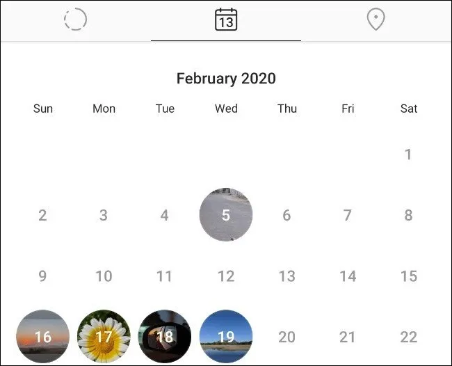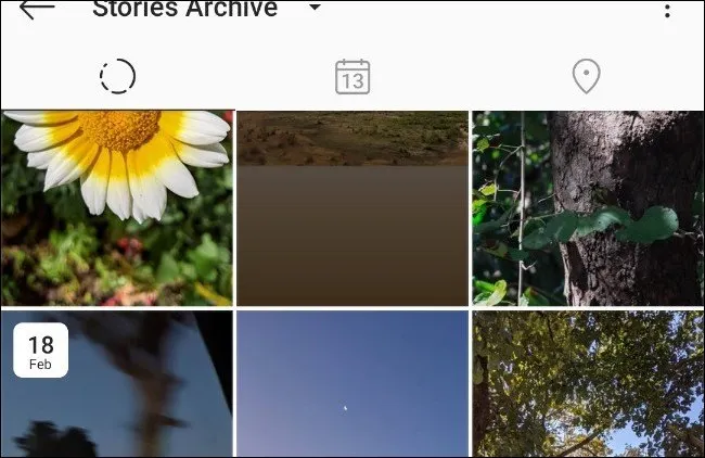 4. Tab tengah menampilkan tampilan kalender yang memungkinkan Anda menemukan cerita berdasarkan kapan Anda mempostingnya. Saat Anda mengetuk tanggal, Instagram memuat semua cerita yang Anda posting pada hari itu.