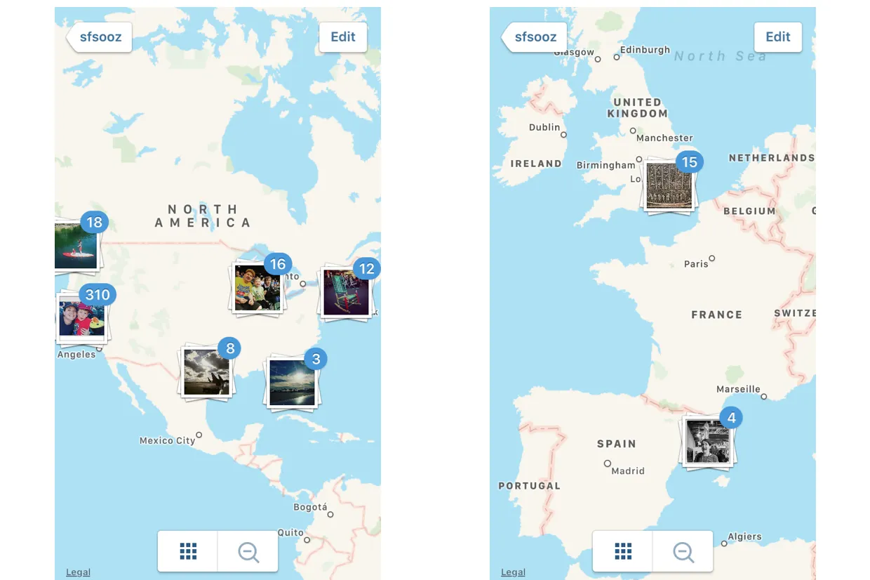 5. Bagian terakhir menunjukkan peta dunia dengan pin di lokasi yang terkait dengan cerita Anda. Anda dapat mencubit ke dalam, untuk melihat lebih banyak lagi secara sekaligus, atau mencubit untuk memindai gambar dan video di area yang lebih sempit.