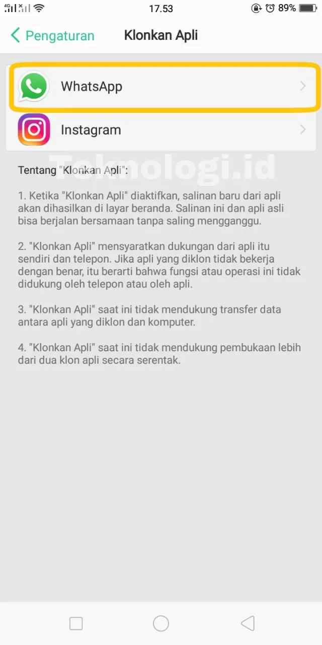 Kemudian, pilih aplikasi mana yang hendak 'dikloning' atau digandakan. Dalam hal ini contohnya adalah WhatsApp.