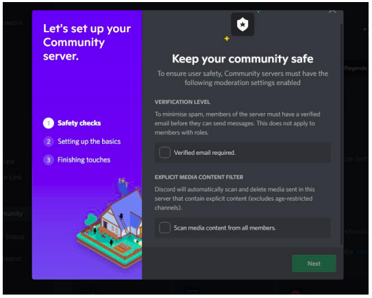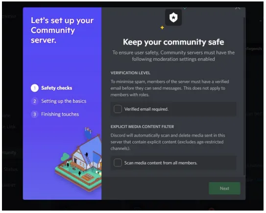 Selanjutnya isi pertanyaan yang diajukan oleh pihak Discord mulai dari pertanyaan ‘Safety checks’, ‘Setting up the basics’, dan ‘Finishing touch’. Pertanyaan ‘Safety Checks’ untuk memverifikasi email kamu dan media konten yang tidak sesuai server. Pertanyaan ‘Setting up the basics’ untuk mengatur pengaturan guidelines server dan pengaturan komunitas update server. Pertanyaan ‘Finishing Touch’ adalah untuk meminta persetujuan kamu untuk mengikuti peraturan dari Discord.