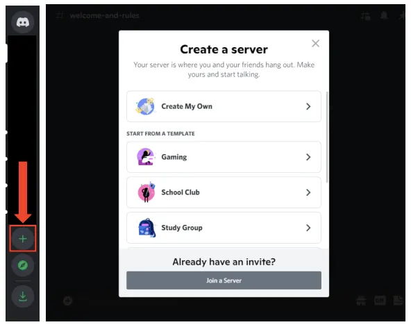 Discord, lalu akan muncul pilihan ‘Create a Server’ untuk memilih template server kamu.