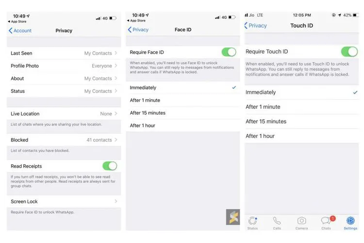 Caranya sangat mudah yaitu dengan membuka Pengaturan > Akun > Privasi > Kunci Layar . Setelah itu pindah ke layar Kunci Layar, aplikasi menunjukkan metode otentikasi yang tersedia yakni Face ID atau Touch ID yang dapat di aktifkan untuk mengunci WhatsAppmu.