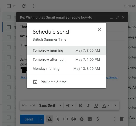 Mungkin kita mencoba berbicara dengan seseorang di zona waktu yang berbeda, mengomeli seseorang tentang suatu peristiwa, atau kita hanya ingin mengingatkan diri kita di masa depan tentang sesuatu. Jika demikian, jadwalkan email.