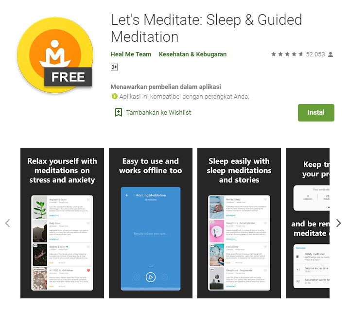 Let’s Meditate akan membantu kalian mengurangi kecemasan, menurunkan stress, meningkatkan kualitas istirahat, menyembuhkan insomnia dan banyak lainnya. Aplikasi ini menampilkan desain antarmuka yang sederhana bagi penggunanya sehingga lebih mudah digunakan, serta tidak adanya iklan di dalam aplikasi ini membuatnya menjadi favorit banyak orang.
