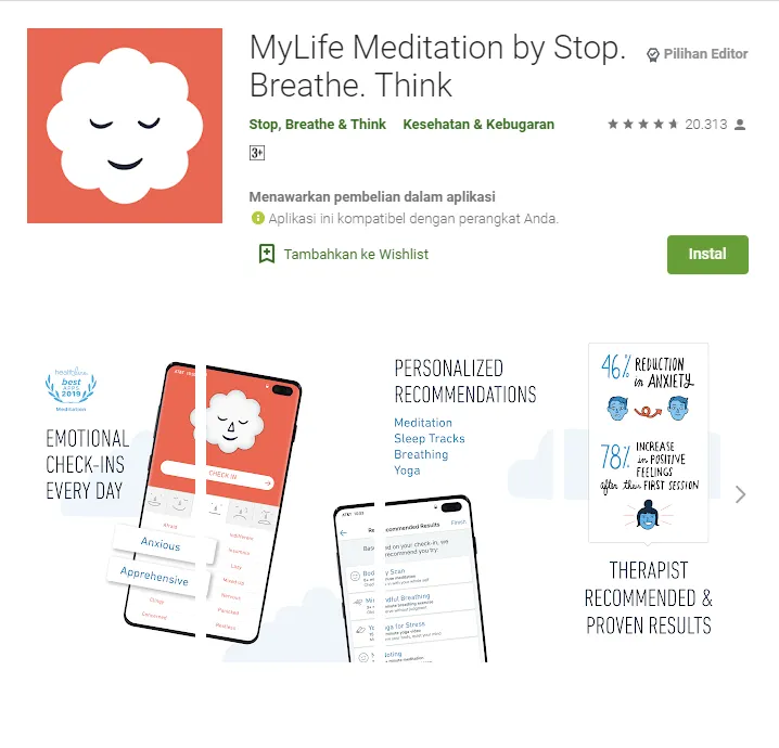 Aplikasi meditasi satu ini patut kalian coba. Aplikasi ini akan membantu mengetahui bagaimana perasaan dan emosi kalian kemudian merekomendasikan meditasi terpadu singkat dan kegiatan mindfulness seperti Morning Meditation, Breathe Mindfully, Slay Your Stress, Sleep Better, Strengthen Focus, Manage Depression, dan banyak lainnya.