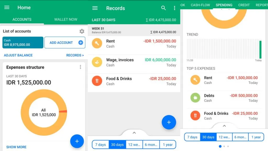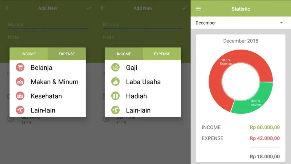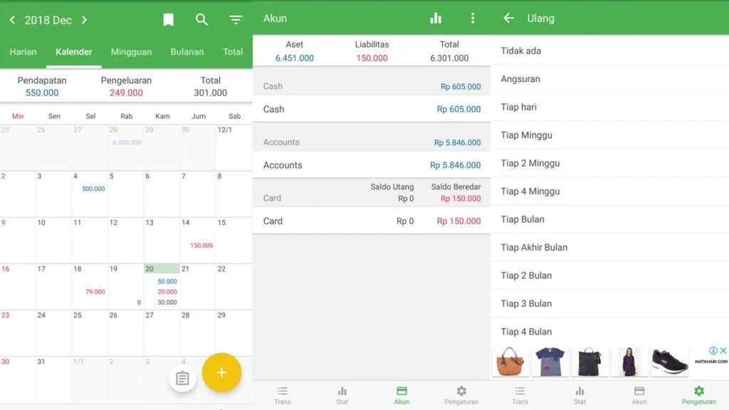 Money Manager ditawarkan dalam versi gratis dan berbayar seharga Rp 44.000 (per Desember 2018). Dari segi fungsi dan antarmuka, aplikasi pengatur keuangan besutan Realbyte ini lebih cocok bagi kalian yang sudah terbiasa mencatat laporan keuangan sehari-hari. Untuk versi gratisnya, aplikasi ini memungkinkan kalian untuk membagi transaksi ke tiga akun, yaitu tunai, rekening, dan kartu pembayaran. Untuk setiap transaksi, Money Manager akan mendata harta dan utang dari ketiga akun tersebut. Tersedia juga opsi untuk mencatat pengeluaran atau angsuran rutin untuk berbagai pilihan periode.