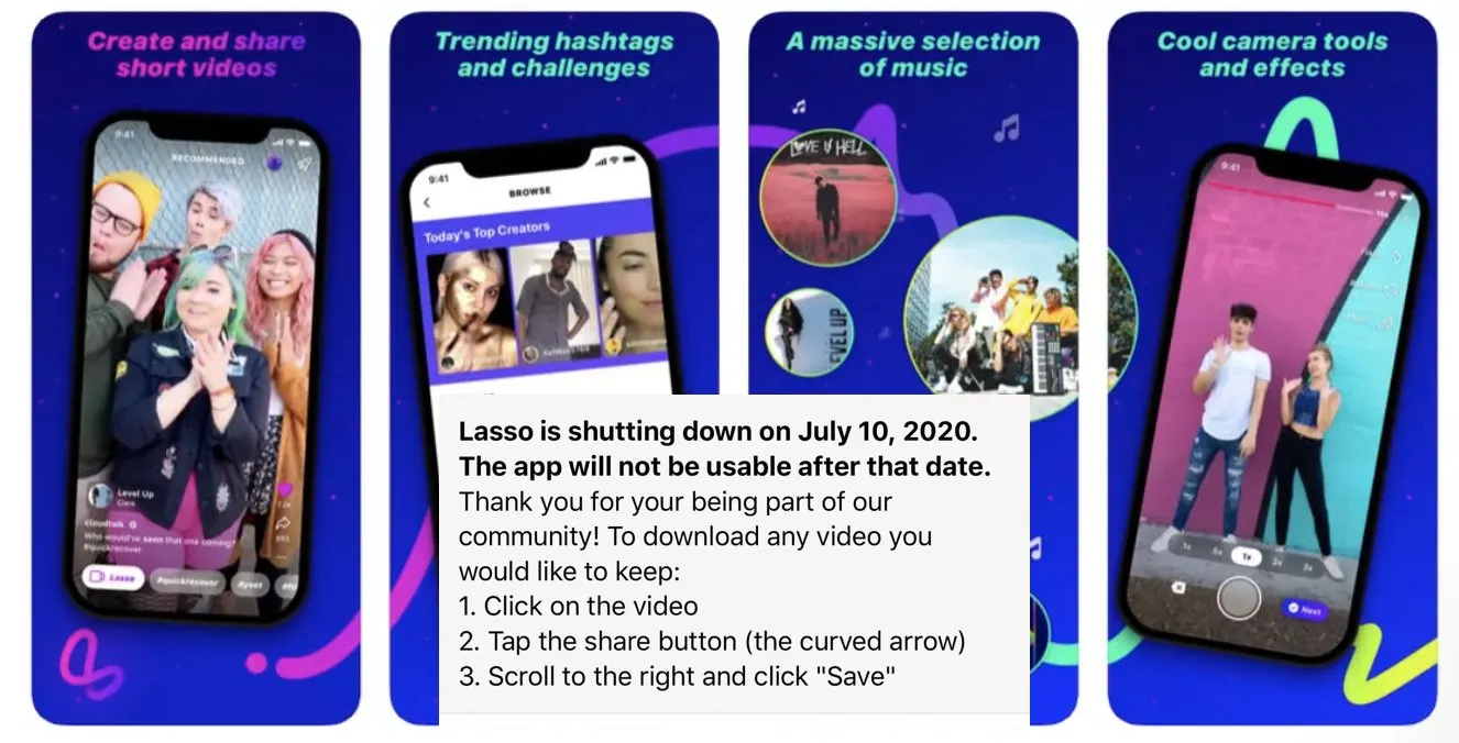 Teknologi.id - Facebook akan berhenti mengembangkan Lasso, aplikasi yang dibuat untuk menyaingi TikTok sejak satu setengah tahun yang lalu. Aplikasi tersebut mengirimkan notifikasi kepada penggunanya bahwa aplikasi tersebut akan ditutup pada tanggal 10 Juli nanti.