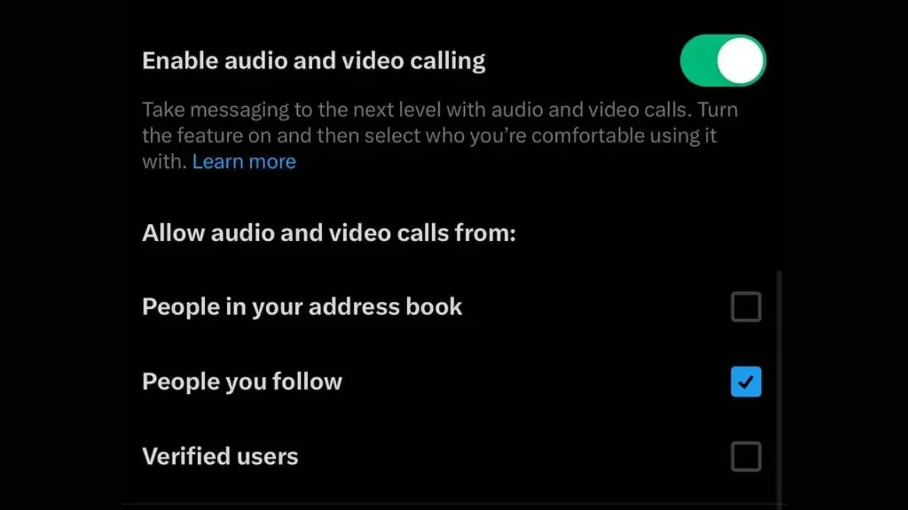 Setelah diaktifkan, pengguna dapat memilih siapa yang mereka izinkan untuk melakukan panggilan audio dan video kepada mereka, apakah hanya dari orang-orang dalam daftar kontak mereka, orang yang mereka ikuti, pengguna terverifikasi, atau ketiganya.