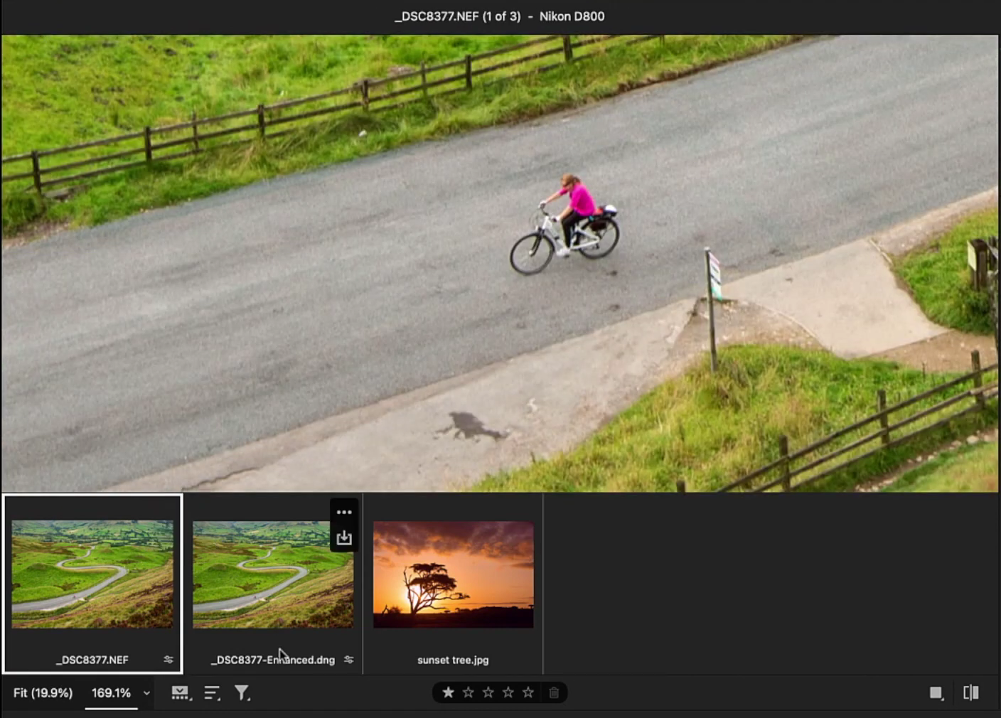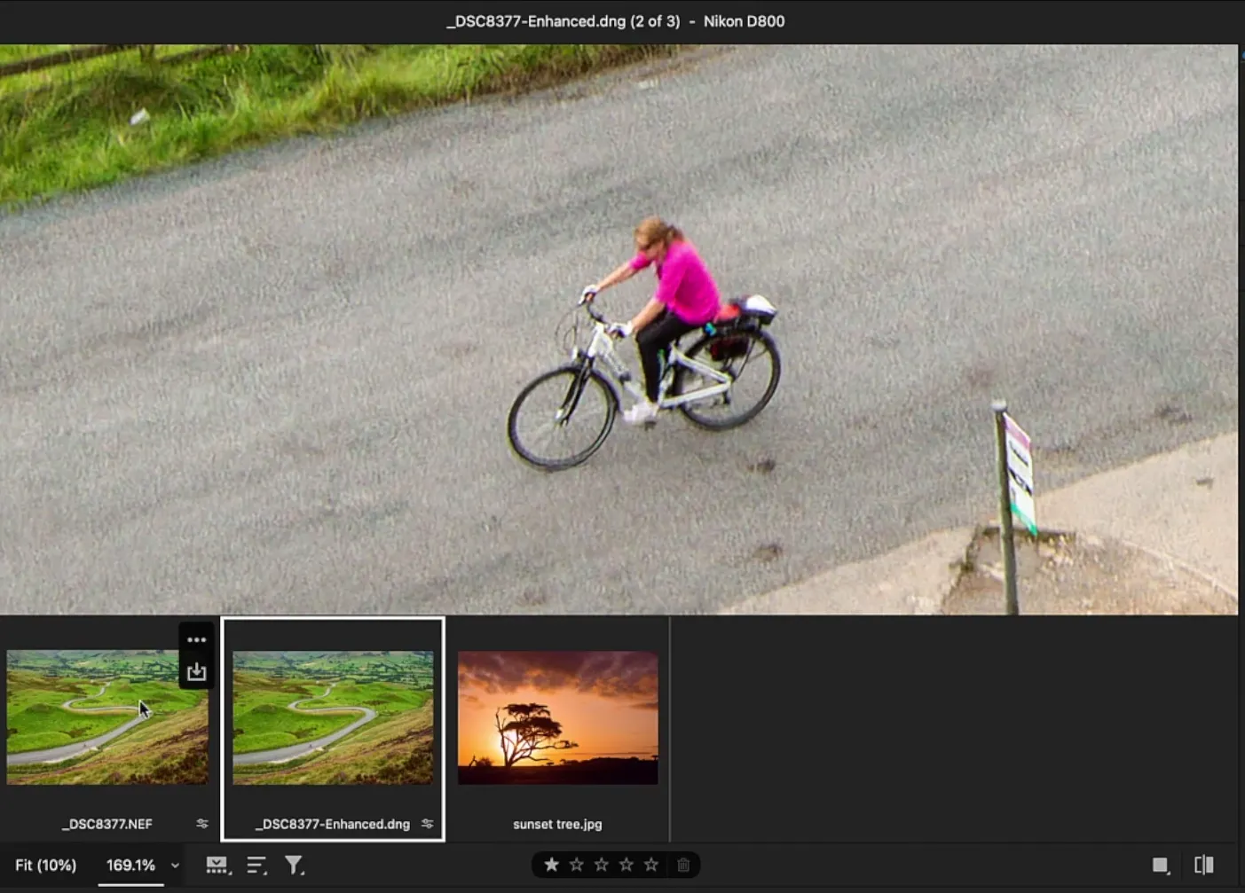 Saat kamu melihat foto yang diperbesar, kamu dapat melihat perbedaannya, terutama di area dengan banyak detail (biasanya disebut sebagai area "frekuensi tinggi"). Pesepeda yang ada di dalam foto menjadi lebih jelas dan semuanya tampak lebih tajam. Peningkatan ini kemungkinan berasal dari fitur terkait yang disebut Raw Details, yang berada di kotak dialog yang sama dengan Super Resolution. Detail raw meningkatkan ketajaman di sekitar tepi objek agar tampak lebih tajam.
