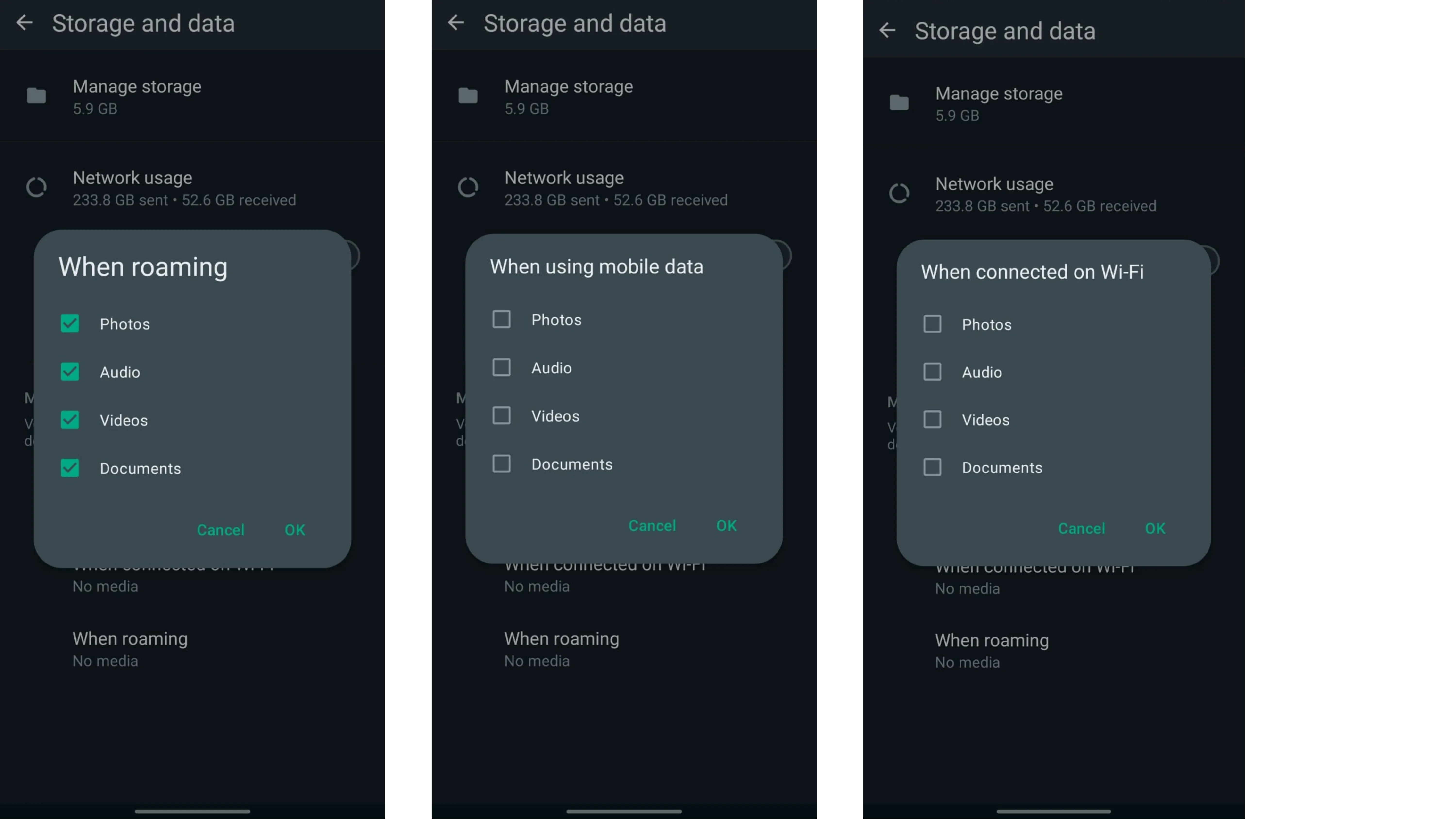 - Lalu, pada kolom Media auto-download atau Unduh otomatis media, pengguna dapat melihat tiga opsi pengaturan untuk pengunduhan otomatis WhatsApp dengan berbagai metode. Mulai dari pengunduhan otomatis lewat jaringan seluler, Wi-Fi, serta saat roaming.