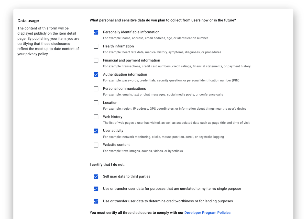 Google sudah menambahkan bagian tersebut pada dashboard Web Store dan pengembang ekstensi Chrome bisa langsung menuliskan data apa saja yang dikumpulkan dari pengguna, beserta kebutuhannya.