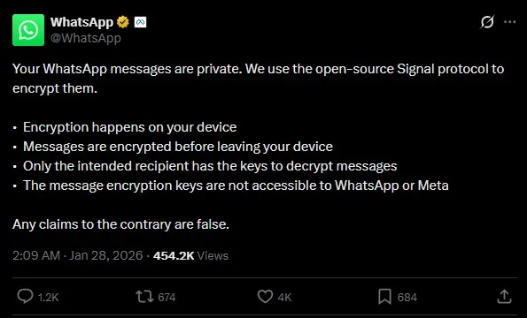 “Ini sepenuhnya salah. WhatsApp tidak bisa membaca pesan karena kunci enkripsi disimpan di ponsel Anda dan kami tidak dapat mengaksesnya,” tulis Cathcart dalam balasannya.