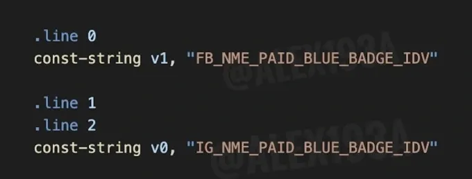 Tangkapan layar yang dibagikan Paluzzi dengan TechCrunch menunjukkan baris yang ditulis sebagai "IG_NME_PAID_BLUE_BADGE_IDV" dan "FB_NME_PAID_BLUE_BADGE_IDV."