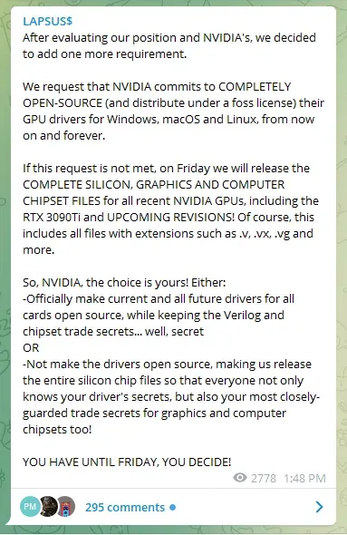 Lapsus$ memperbarui tuntutannya hari ini, menambahkan kondisi bahwa Nvidia secara permanen membuat driver GPU-nya sepenuhnya open-source, dan mengatakan bahwa perusahaan memiliki waktu hingga Jumat minggu ini untuk membuat keputusan.