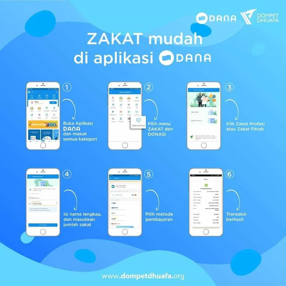 Salah satu dompet digital, DANA juga bekerja sama dengan lembaga Dompet Dhuafa untuk menghadirkan fitur membayar zakat online melalui platform tersebut.