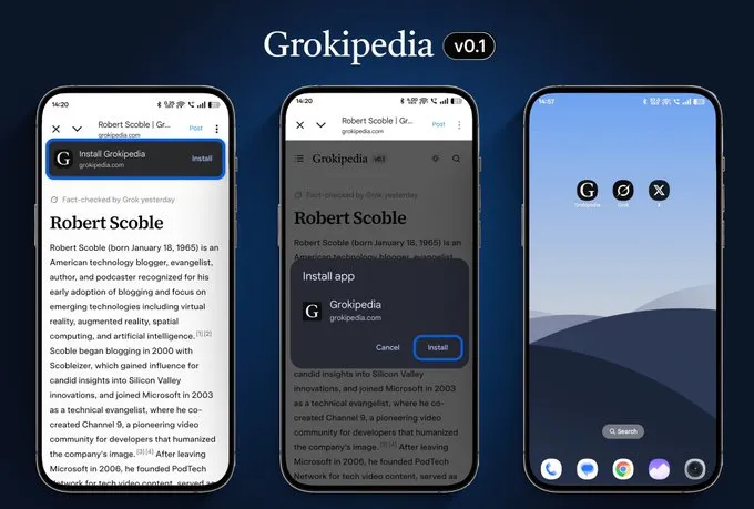 Caranya dengan mengetuk tulisan “tambahkan ke layar utama”  lalu mulai mengunduh. Setelah unduhan selesai, maka Grokipedia sudah berada pada layar beranda pengguna.