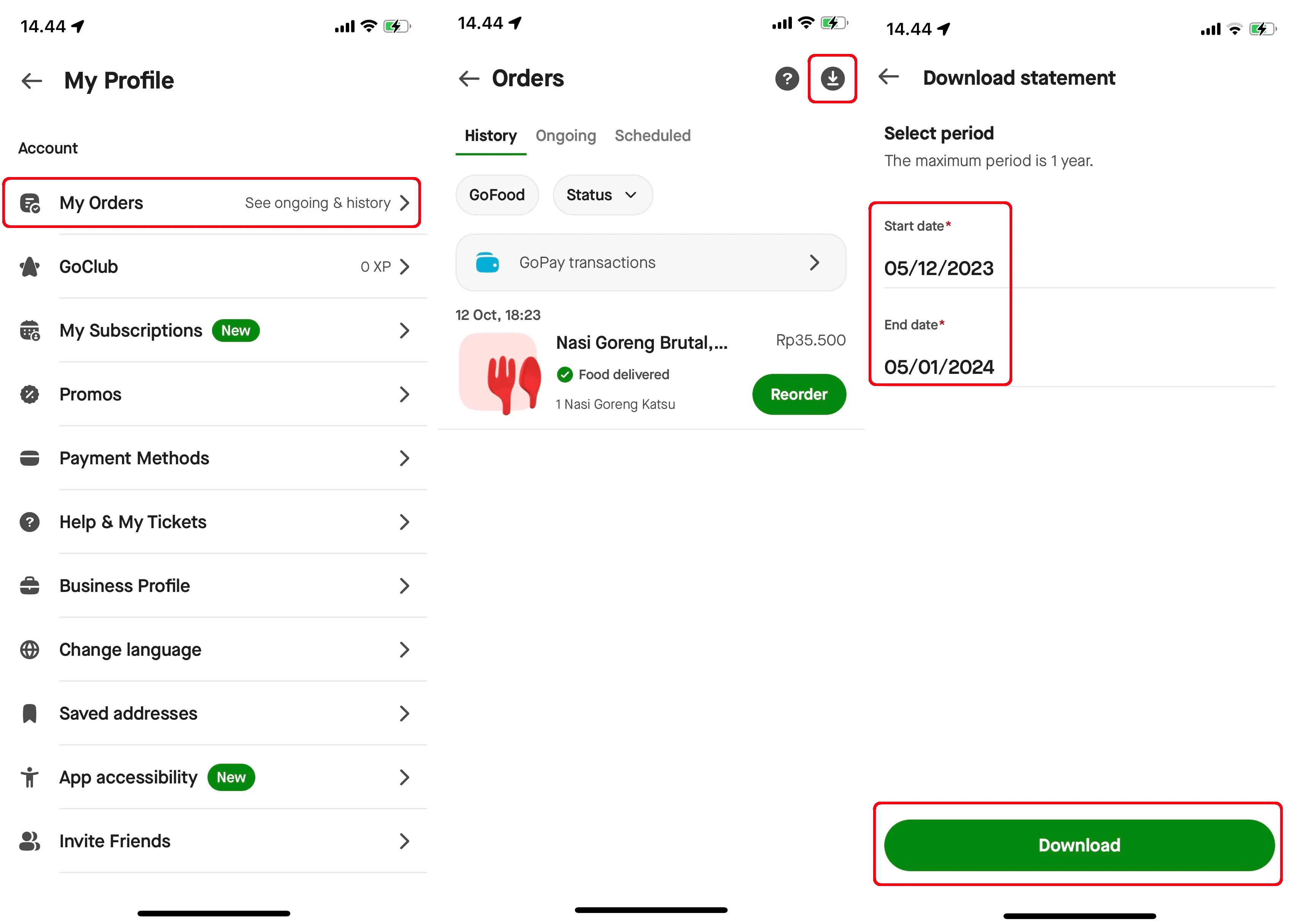 Ketika berada di halaman profil akun Gojek kamu, lalu klik menu "Pesanan" dan akan memunculkan opsi untuk mendownload laporan transaksi dalam kurun waktu tertentu