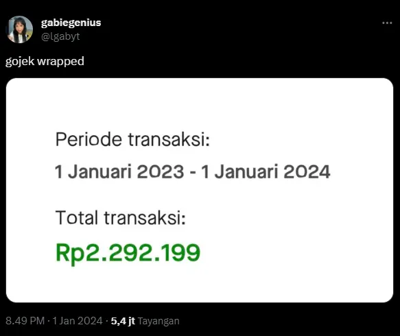 Teknologi.id - Baru-baru ini, media sosial X sedang ramai membicarakan unggahan salah satu pengguna mengenai Gojek Wrapped. Dalam unggan Twitter @lgabyt pada hari Senin (1/1/2024), akun tersebut menuliskan "Gojek Wrapped" sambil mengunggah screenshoot layar total transaksi di aplikasi Gojek selama setahun, dari 1 Januari 2023 sampai dengan 1 Januari 2024.