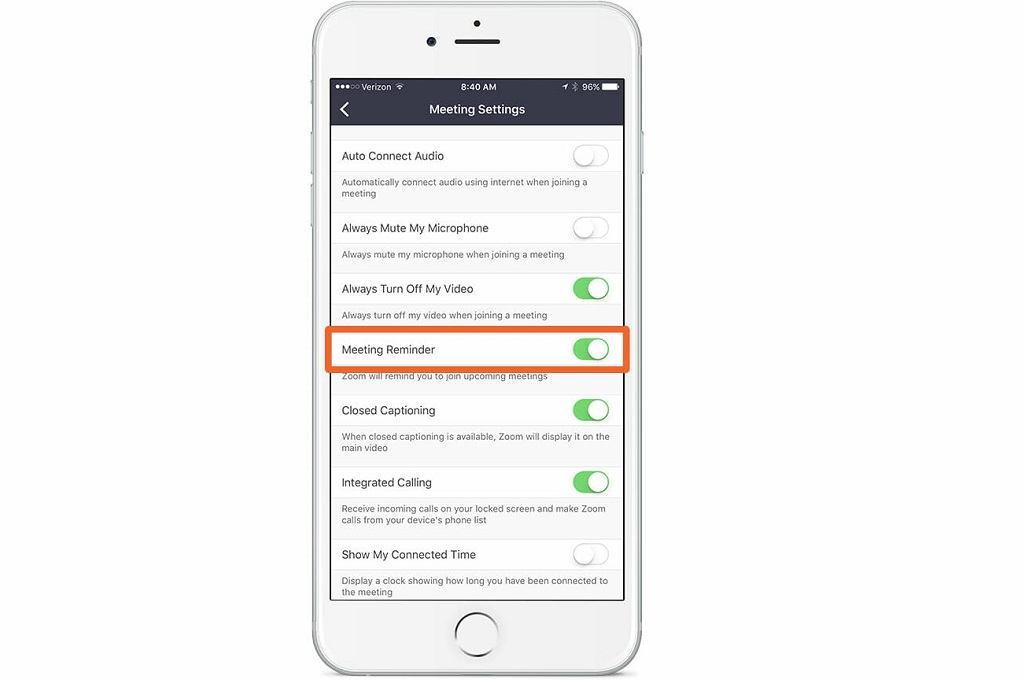 - Geser tuas di sebelah opsi Meeting Reminder hingga berwarna hijau