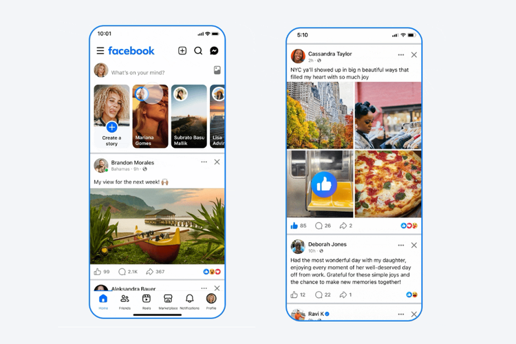 Salah satu perubahan paling mencolok adalah tampilan foto di Feed. Ketika pengguna mengunggah beberapa foto sekaligus, Facebook kini menampilkannya dalam format grid, bukan lagi carousel panjang seperti sebelumnya. Pendekatan ini membuat tampilan lebih ringkas, modern, dan mudah dipindai mirip dengan gaya visual Instagram.