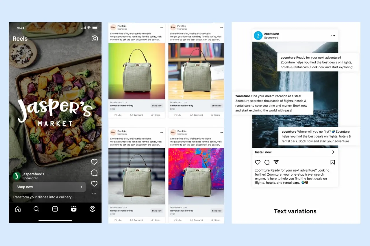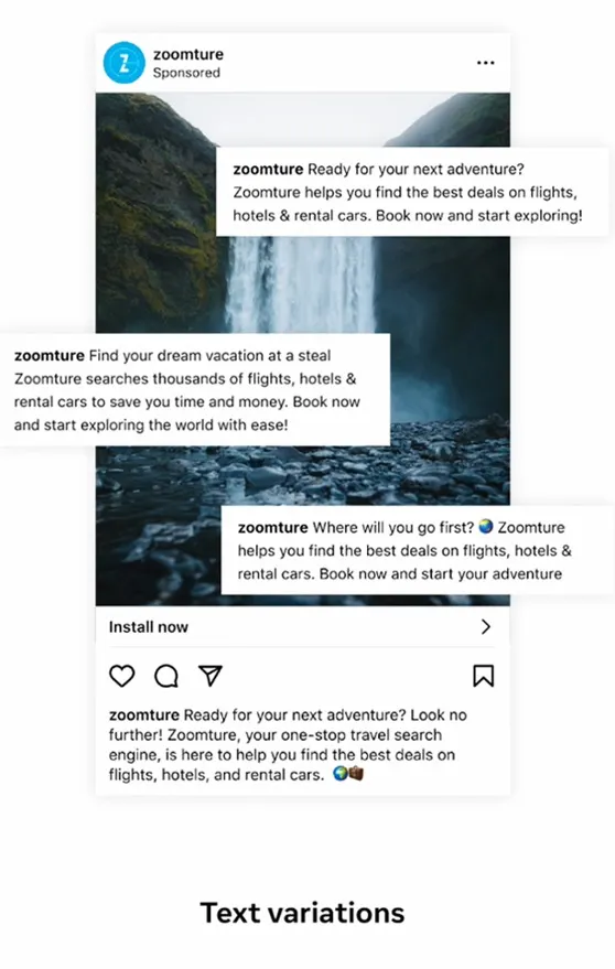 Fitur ketiga yang ditawarkan adalah fitur variasi teks pada Meta Ads Manager. Fitur ini dapat menghasilkan hingga enam variasi teks berbeda berdasarkan teks/caption asli pengiklan. Fitur ini dapat menyoroti kata kunci tertentu dan frasa masukan yang ingin ditekankan oleh pengiklan. Pengiklan dapat meng-edit keluaran yang dihasilkan atau hanya tinggal memilih keluaran terbaik yang sesuai dengan gaya dan karakter pengiklan. Meta juga dapat menampilkan kombinasi teks yang berbeda kepada target orang yang berbeda untuk melihat mana yang memberikan respons terbaik. Namun, Meta tidak akan menampilkan detail kinerja untuk setiap variasi teks tertentu.