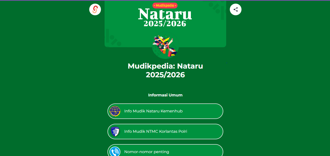 Mudikpedia Nataru ini dapat diakses secara gratis melalui tautan https://s.id/MudikpediaNataru. Dalam satu halaman, masyarakat bisa menemukan beragam informasi resmi dan terkini yang dibutuhkan selama perjalanan, mulai dari kondisi lalu lintas real time, pengaturan arus kendaraan, tarif jalan tol, hingga daftar nomor layanan darurat nasional dan daerah.