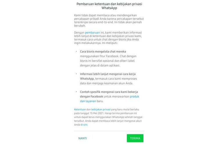 Di akhir notifikasi, pengguna akan diminta untuk memilih, yaitu "Nanti" dan "Terima". Namun, jika tidak menerima, akan terputus dari WhatsApp dan tidak bisa memakai WhatsApp lagi.