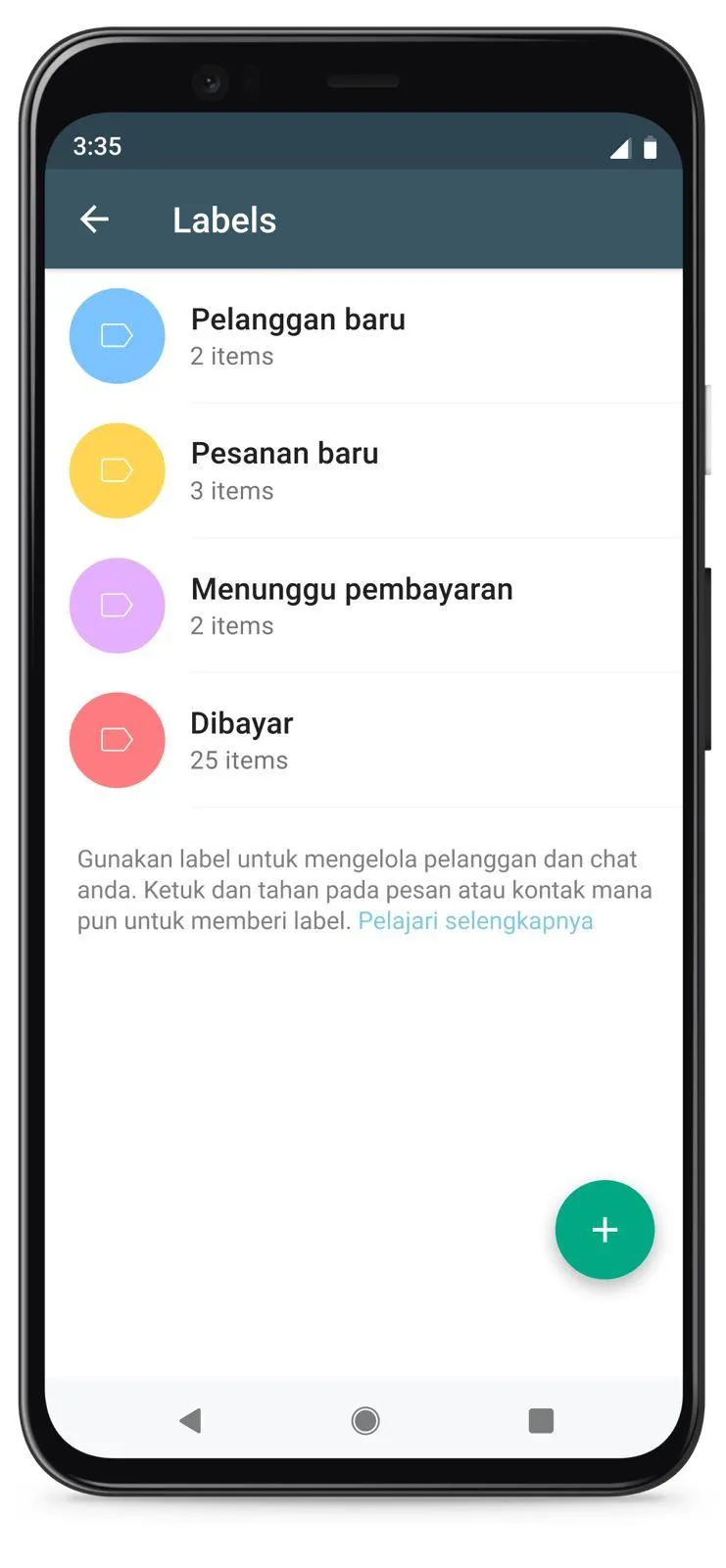 Salah satu cara untuk melakukannya adalah dengan menggunakan Koleksi katalog untuk mengelompokkan dan mengatur produk Anda ke dalam kategori tertentu sehingga memudahkan pelanggan untuk menelusuri produk Anda. Untuk melacak percakapan, tandai percakapan tertentu dengan deskripsi yang dapat disesuaikan untuk melacak hal-hal seperti pembayaran yang tertunda, pelanggan baru, dll. (label hanya dapat dilihat oleh Anda, bukan oleh pelanggan).