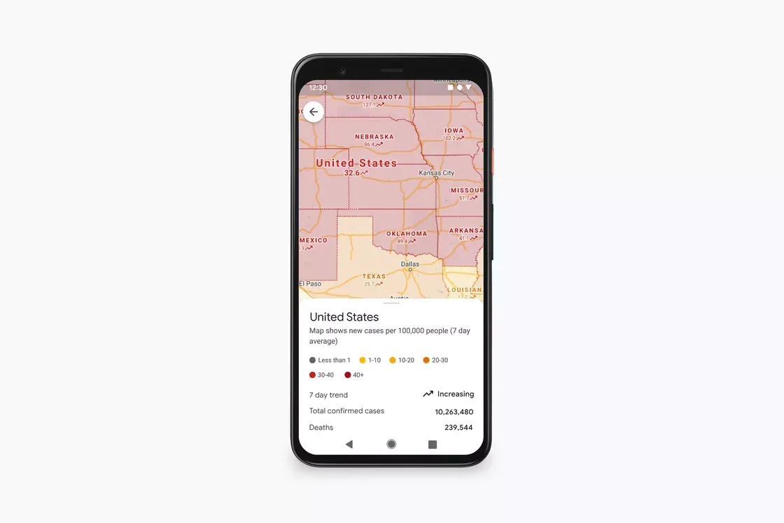 Google juga menambahkan overlay Covid-19 di aplikasi Google Maps, termasuk detail jumlah kasus yang terdeteksi di suatu area, serta menautkan informasi mengenai Covid-19 yang disediakan oleh pemerintah setempat. Google menyebutkan fitur ini bisa membantu penggunanya untuk menemukan informasi mengenai aturan dan regulasi lokal ketika sedang bepergian.