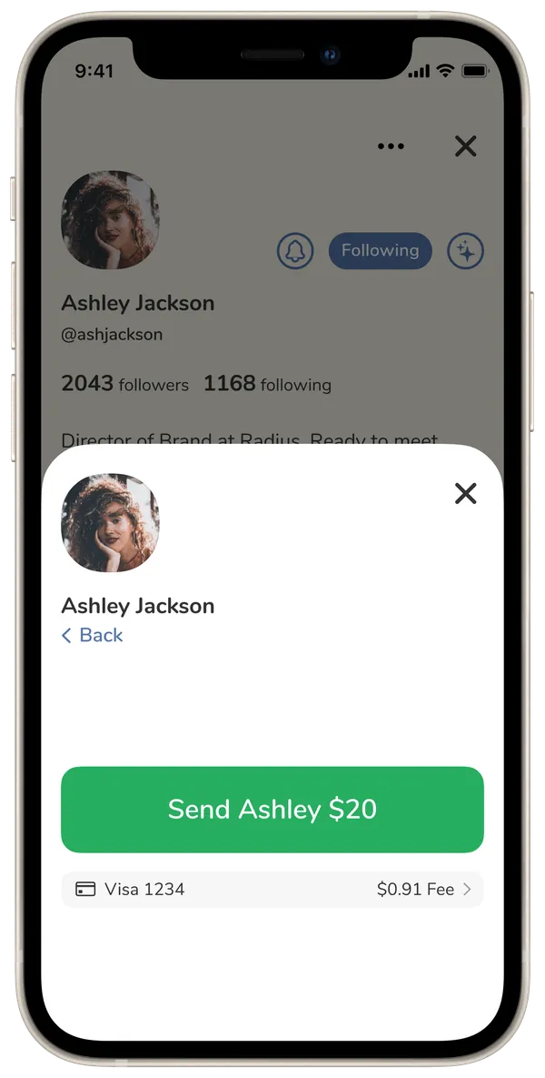 Untuk membayar pencipta Clubhouse, ketuk profil mereka, lalu ketuk tombol "Kirim Uang", lalu pilih berapa banyak nominal yang akan Anda kirim.