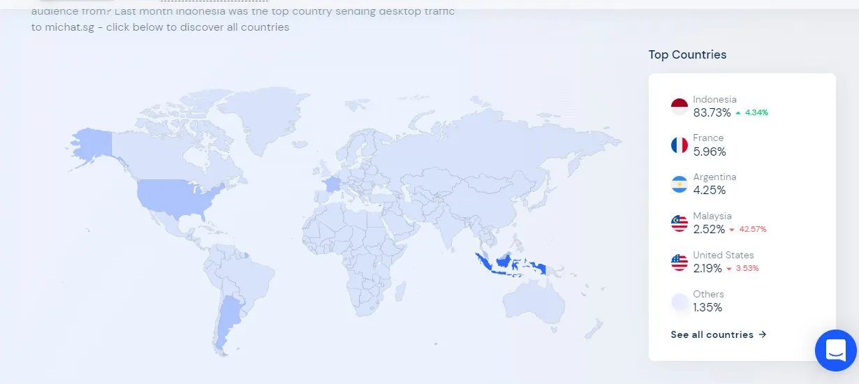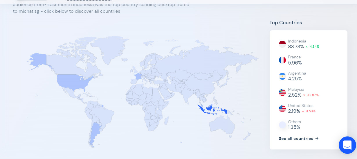 "Negara mana yang paling banyak mengirim lalu lintas ke michat.sg akhir-akhir ini? Dari mana audiens inti mereka berasal? Bulan lalu Indonesia adalah negara teratas yang mengirimkan lalu lintas desktop ke michat.sg," kata Similarweb dalam keterangannya.