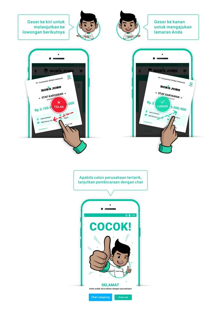 Rob’s Jobs mempermudah para pencari kerja dengan membuat tampilan pada aplikasi seperti model interaksi yang mirip seperti Tinder. Apabila kamu menyukai sebuah lowongan kerja, kamu hanya perlu menggeser layar (swipe) ke arah kanan dan secara otomatis kelengkapan biodata profil yang telah kamu buat akan diteruskan kepada pembuat lowongan kerja tersebut. Proses ini sangat ramah lingkungan serta dapat menghemat waktu antara kedua belah pihak.