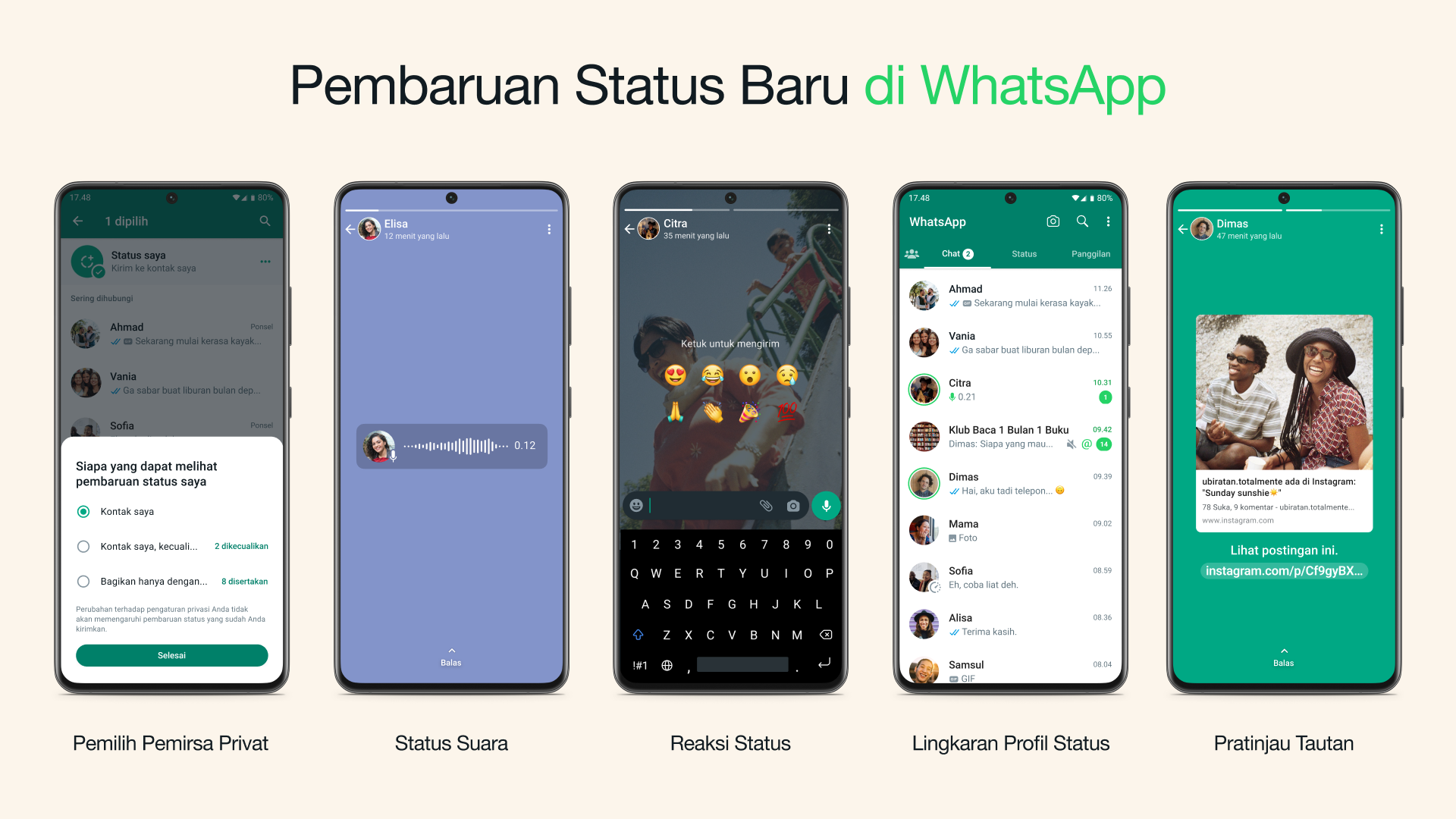 Berikut ini 5 fitur baru pada status WhatsApp yang dihadirkan guna memudahkan pengguna mengekspresikan diri serta terhubung dengan orang lain.