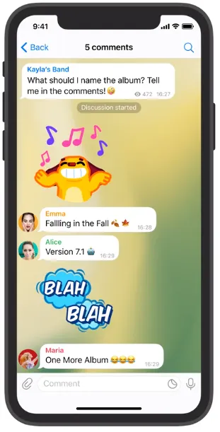 Telegram kini menambahkan kolom komentar di dalam Channels. Tombol komentar akan muncul pada pesan yang di-posting di Channels. Pengguna bisa mengirimkan GIF, pesan suara, stiker, dan lain-lain sebagai komentar terhadap post tersebut. Telegram juga mengatakan bahwa admin dapat mengontrol komentar di dalam Channel untuk menjaga kesopanan.