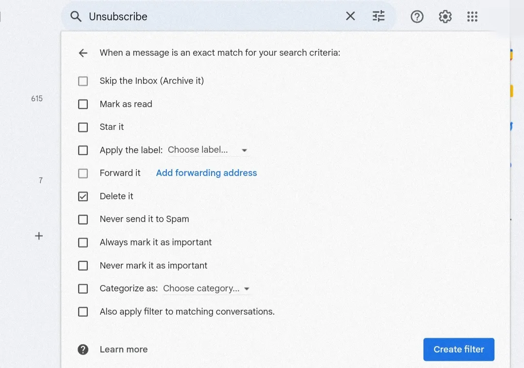 - Klik "Create filter", lalu centang pada kotak "Delete it".