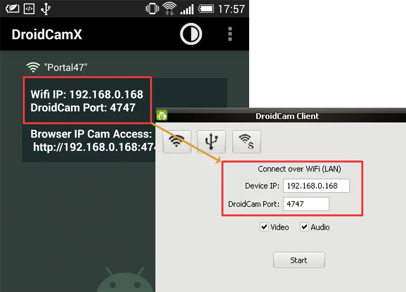 4. Masukkan angka-angka "Device IP" dan "DroidCam Port" yang tertulis pada aplikasi Android ke PC. Centang "Audio" dan "Video" lalu pilih "Start".