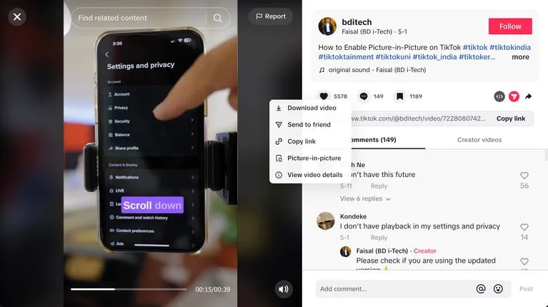 Dengan fitur PiP, pengguna bisa membuka aplikasi lain sambil scrolling konten TikTok, misalnya sambil membalas pesan atau scrolling aplikasi lain seperti Instagram. Untuk mengaktifkan fitur ini, ketuk dan tahan video yang ditonton hingga muncul barisan menu pengaturan. Tombol PiP akan muncul di sebelah menu “Playback speed”. Begitu diaktifkan, jendela TikTok akan mengecil dan pengguna akan dibawa keluar ke halaman menu ponsel, sebelum kemudian bisa memilih untuk membuka aplikasi lain. Foto: KompasTekno Jendela kecil ini akan mengambang (floating window) di atas aplikasi lain yang dibuka. Pemosisiannya bisa diletakkan di bagian manapun pada layar selain di bagian tengah yang mana akan menghalangi esensi membuka aplikasi lain. Pada jendela mengambang ini pula, fitur PiP dilengkapi ikon Next dan Previous untuk memutar video TikTok selanjutnya juga sebelumnya. Terdapat juga ikon Play/Pause untuk memainkan dan menjeda video. Apabila kalian ingin seutuhnya menyisihkan jendela ini, ada juga ikon X untuk menutup jendela tersebut. Dan apabila ingin kembali ke aplikasi, kalian bisa klik ikon Full Screen. Baca Juga: Cara Menghilangkan Watermark TikTok Tanpa Aplikasi Penggunaan fitur ini lewat PC memungkinkan pemosisian jendela TikTok di manapun pengguna mau. Ukuran jendela pun juga bisa diatur senyamannya. Caranya pun juga mudah. Masukin halaman For You, klik kanan pada video manapun, lalu pilih Picture-in-Picture. Foto: Make Use Of Dengan fitur ini, kalian bisa lebih produktif di aplikasi lain walaupun sambil menyaksikan video TikTok. Apabila kalian belum bisa mengaksesnya, pastikan aplikasi TikTok kalian sudah mendapat update versi terbaru. Selamat mencoba!
