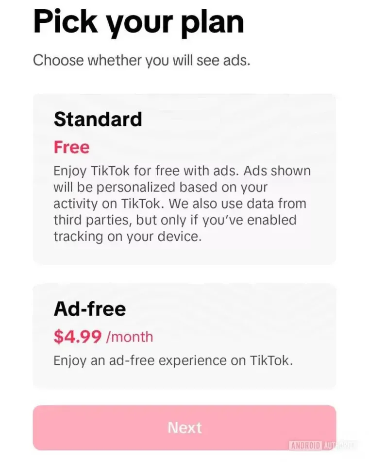 Laporan ini diungkap oleh Android Authority, yang berbagi screenshot dari TikTok. Tangkapan layar tersebut berisikan TikTok meminta pengguna untuk memilih antara tetap menggunakan aplikasi dalam versi gratis dengan iklan atau versi berbayar tanpa iklan.