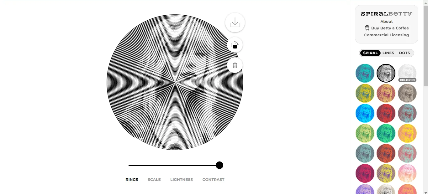 Spiral Betty adalah salah satu platform pengeditan foto online gratis. Seperti namanya, layanan Spiral Betty akan membuat foto hasil editan-mu menjadi unik dan menarik. Selain efek spiral, Spiral Betty juga menyediakan fungsi lain, seperti efek garis (line) atau titik (dots).