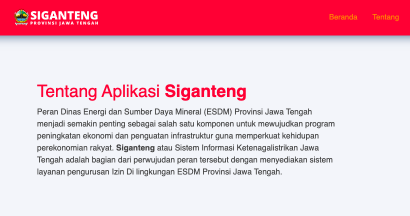 Sistem, informasi Ketenagalistrikan Jawa Tengah (Siganteng) merupakan program dari Provinsi Jawa Tengah. Program berfungsi untuk pengajuan terkait izin terkait ESDM di Jawa Tengah.
