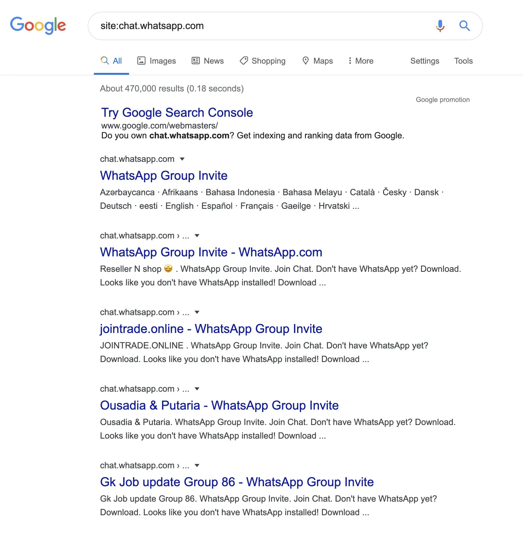 Tak kurang dari 470.000 tautan grup Whatsapp ditemukan Jane ketika memasukkan kata kunci "Site:chat. whatsapp.com" di pencarian Google.