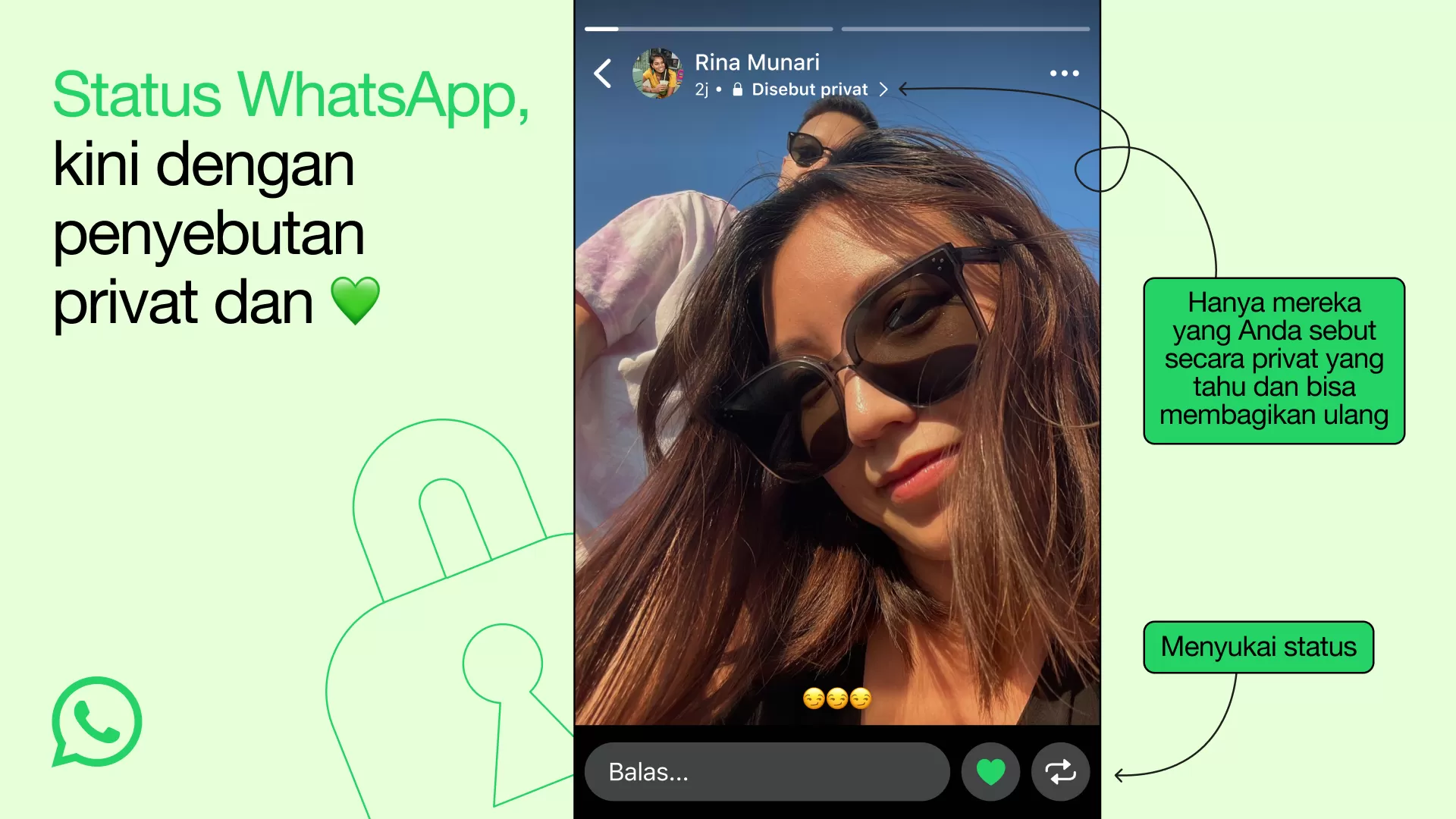 Selain fitur hati atau tanda suka, WhatsApp tidak berhenti berinovasi dengan memperkenalkan fitur private mention. Melalui fitur ini, pengguna dapat menandai pengguna lain (mention) di WA Status yang diunggah. Kontak yang belum tersimpan pun turut dapat ikut ditandai dalam postingan tersebut.