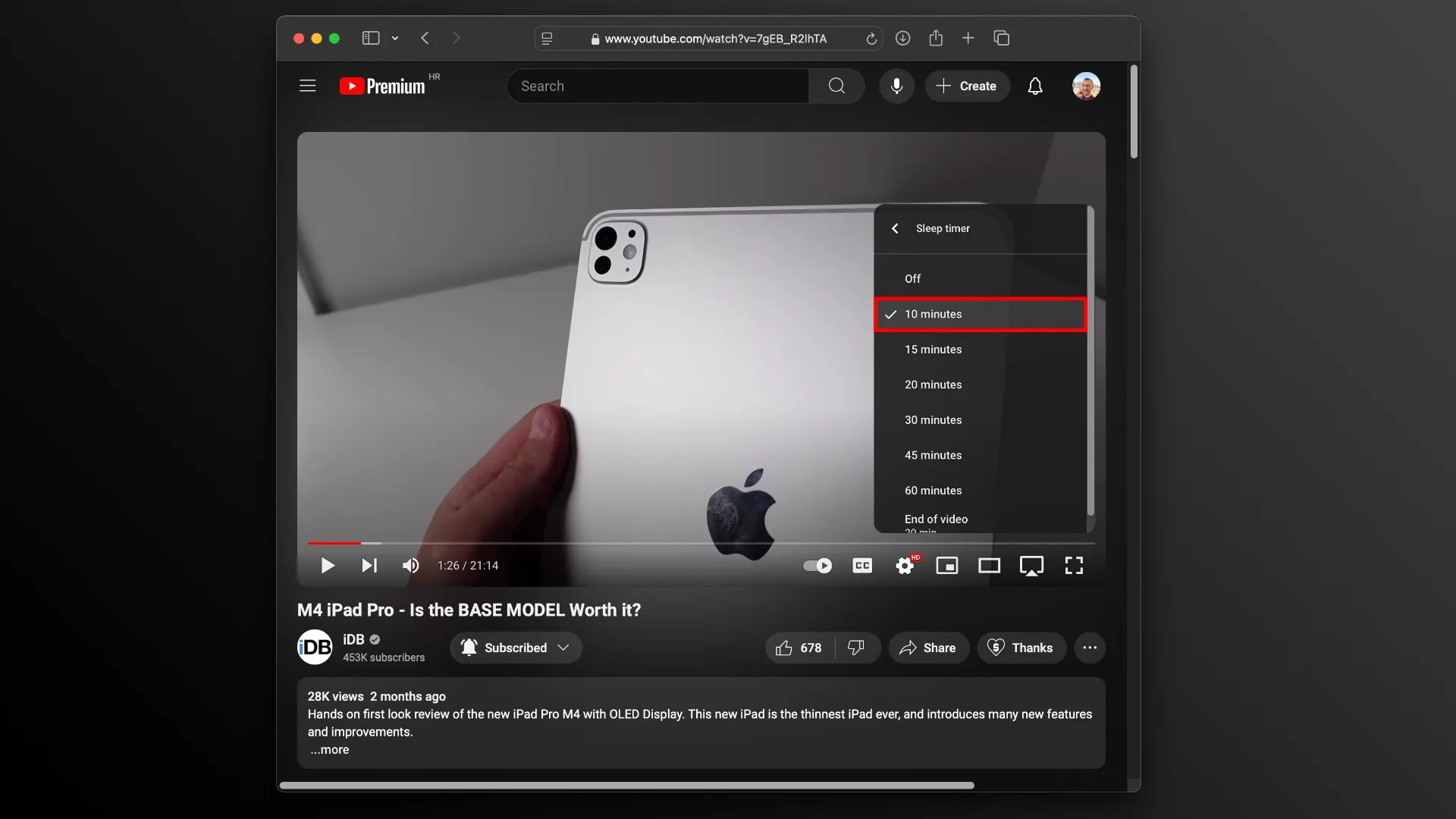 Fitur Sleep Timer memungkinkan pengguna untuk memilih jeda waktu pemberhentian video setelah 10 menit, 15 menit, 20 menit, 30 menit, 45 menit, 60 menit, atau setelah video berakhir.
