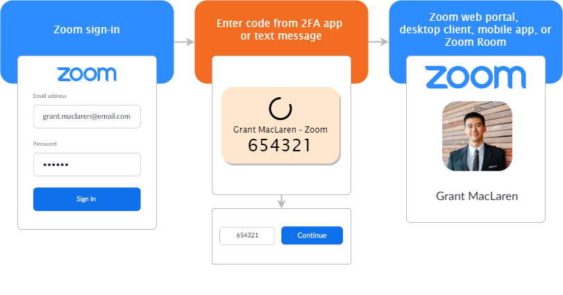 Sebagai faktor kedua dalam proses autentikasi akun dalam fitur 2FA ini, pengguna memiliki opsi untuk menggunakan aplikasi yang mendukung protokol Time-Based One-Time Password (TOTP), seperti Google Authenticator, Microsoft Authenticator, dan FreeOTP, atau dapat meminta Zoom untuk mengirimkan kode akses melalui SMS atau panggilan telepon.