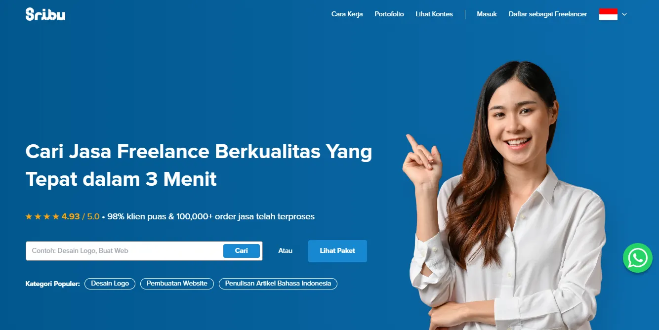 Situs terpercaya untuk para freelancer mencari klien terutamanya dalam desain grafis, pengembangan web yang mencakup pemasaran digital, kepenulisan dan bahkan pekerjaan kreatif unik. Desain Sribu dirancang untuk memudahkan navigasi antara freelancer dan klien. Tersedianya fitur pencarian yang memungkinkan clien menemukan freelancer terbaik. Dari segi keamanan, Sribu menawarkan layanan pelanggan yang responsif dan siap menangannya atau masalah yang mungkin di hadapi freelancer. sistem transparan yang memastikan pembayaran dilakukan dengan adil. Untuk penghasilan yang bisa freelancer dapat di sesuaikan dengan harga yang telah di tetapkan oleh freelancer tentukan di awal di sesuaikan juga dengan bentuk pelayanan freelancer.