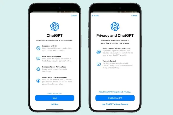 Yang pertama adalalh integrasi Apple dengan ChatGPT. Siri sekarang dapat menyerahkan permintaan ke ChatGPT, sebuah fitur yang sepenuhnya sesuai keputusan pengguna. Dalam fitur ini, pengguna tidak memerlukan akun, dan apa pun yang pengguna minta, Siri dapat dikirim ke ChatGPT hanya jika pengguna mau.