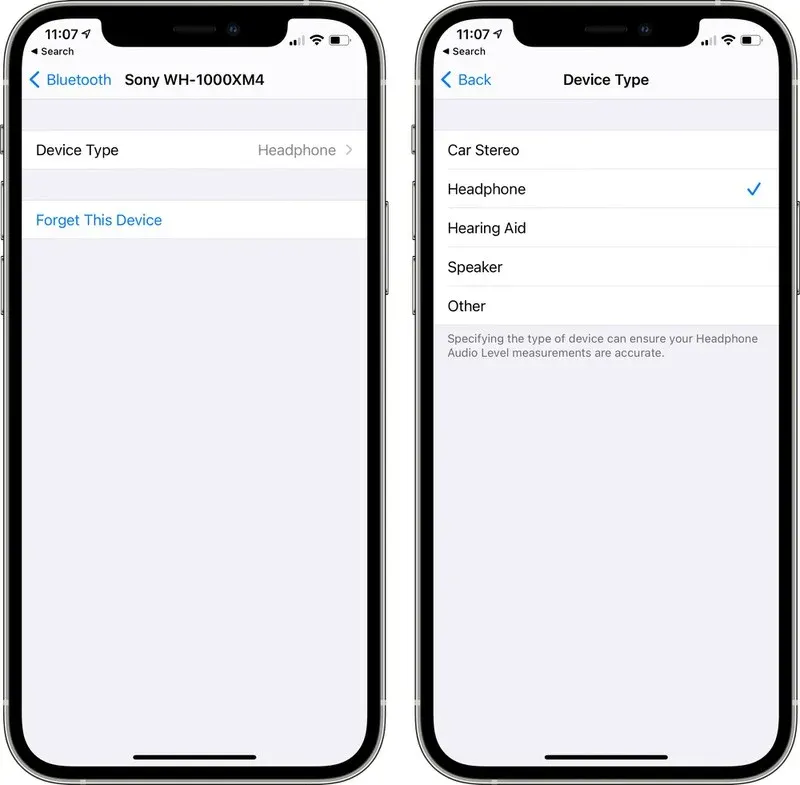 iOS 14.4 menyertakan pengaturan untuk menentukan jenis perangkat untuk perangkat audio pihak ketiga yang terhubung dengan Bluetooth. Sehingga, pengukuran tingkat audio headphone dapat dilakukan dengan benar. Apple melacak tingkat audio headphone agar dapat memberikan peringatan jika musik yang diputar telah berada di tingkat yang dapat membahayakan kesehatan pendengaran.